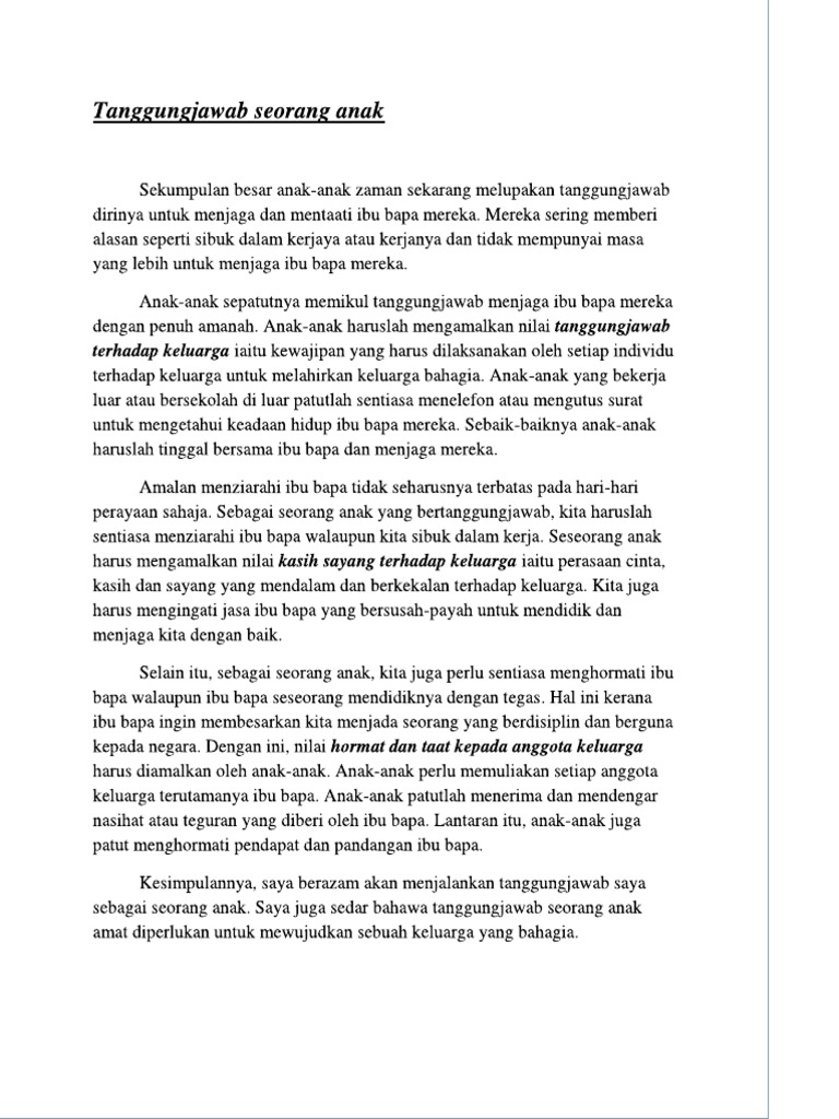 Nilai kasih sayang ibu bapa terhadap anak anak. Pengorbanan ibu bapa kita juga tidak terhenti di situ sahaja. Selain itu ibu bapa menggalakkan anak anak untuk menyertai pelbagai aktiviti kemasyarakatan. Nilai kasih sayang dalam keluarga.