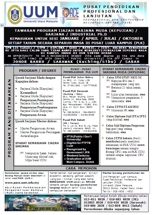 Pusat Pendidikan Profesional Lanjutan Uum Kemasukan Oktober 2019 Dibuka Sekarang Miliki Ijazah Sarjana Muda Dengan Kepujian Uum Dengan Syarat Kemasukan Minimum Sijil Pelajaran Malaysia Spm Permohonan Kemasukan Pendidikan